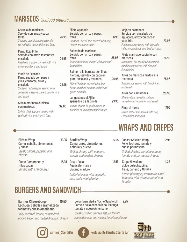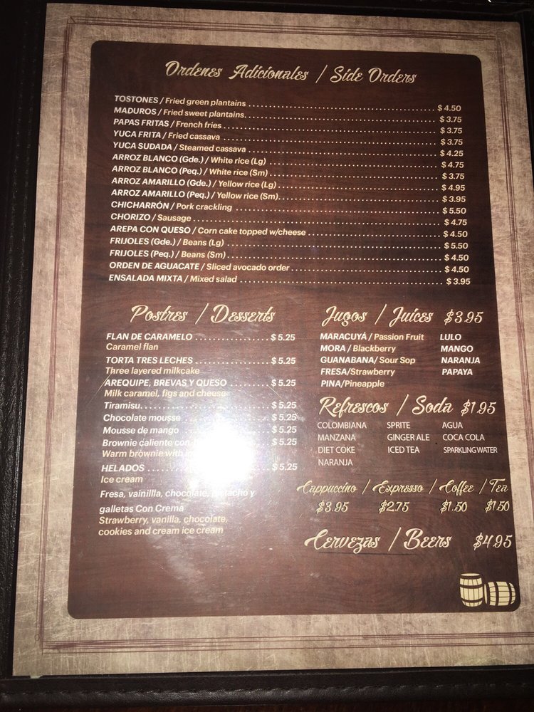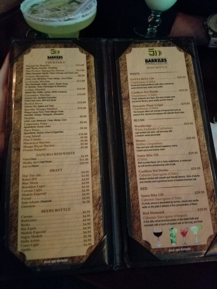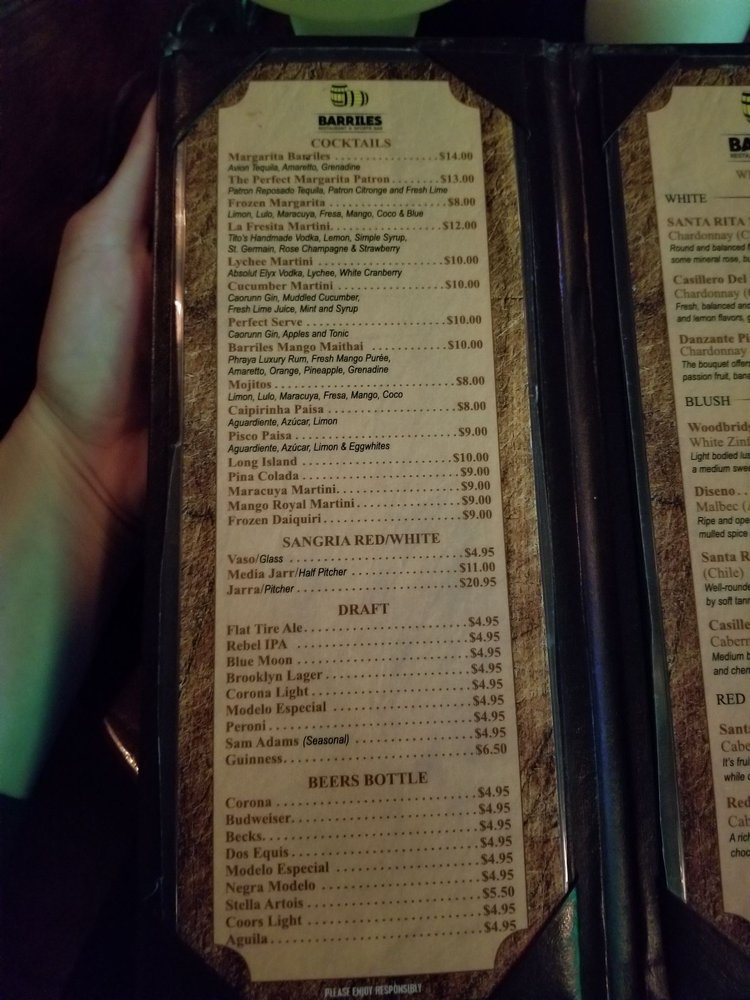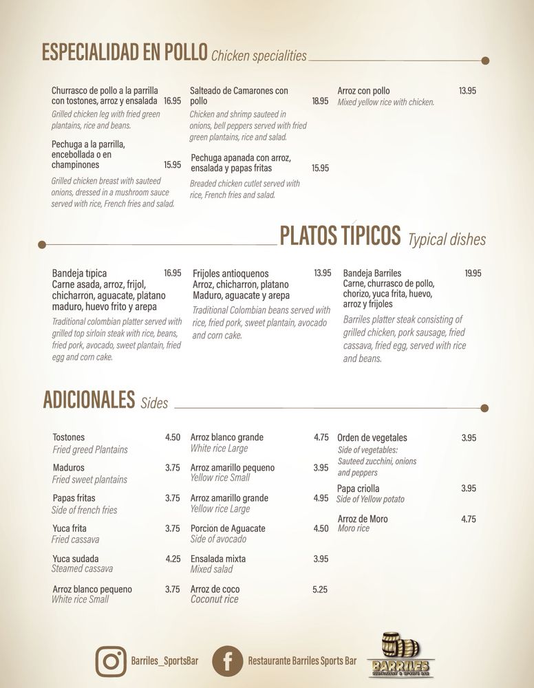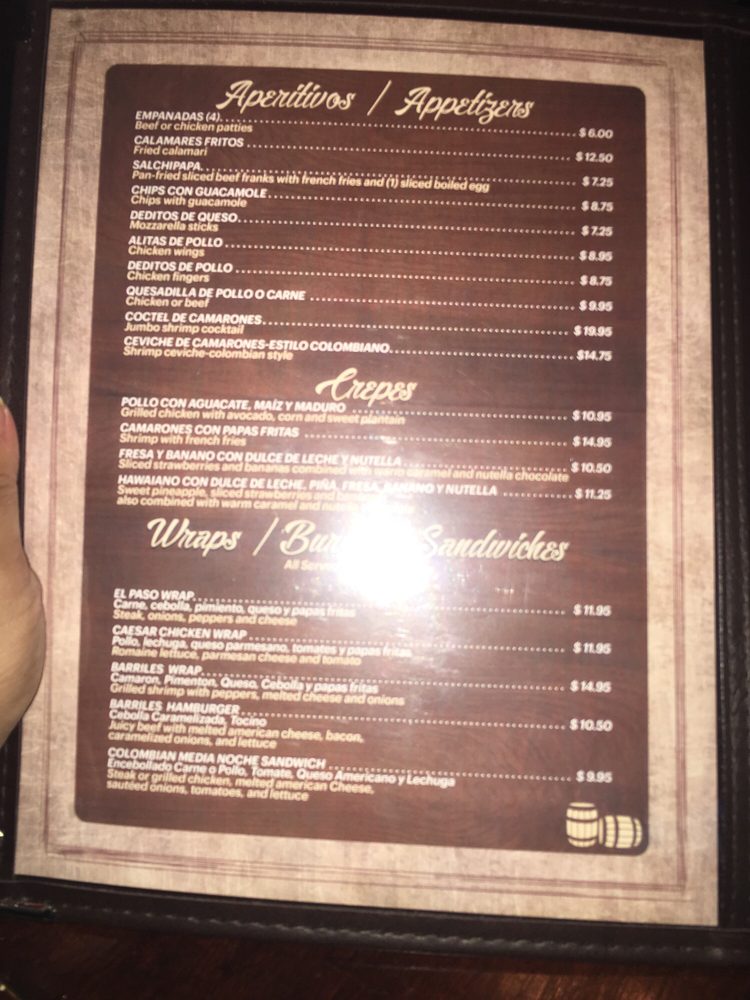 Introducing the menu at Barriles Restaurant and Sports Bar, located in Jackson Heights, NY, a hidden gem offering a unique blend of American and Colombian cuisine. With a homely and family-friendly ambiance, Barriles surprises patrons with its spacious interior adorned with floral details, making it perfect for groups and families. The menu boasts fantastic Colombian food, including the popular Colombiana burger and flavorful steaks. The drink selection, highlighted by margaritas with just the right amount of tequila, is a hit with patrons. While enjoying their meal, guests can catch their favorite sports game on TV or challenge friends to a game of pool. With excellent service, great food, and a welcoming atmosphere, Barriles Restaurant and Sports Bar is a must-visit for a memorable dining experience.