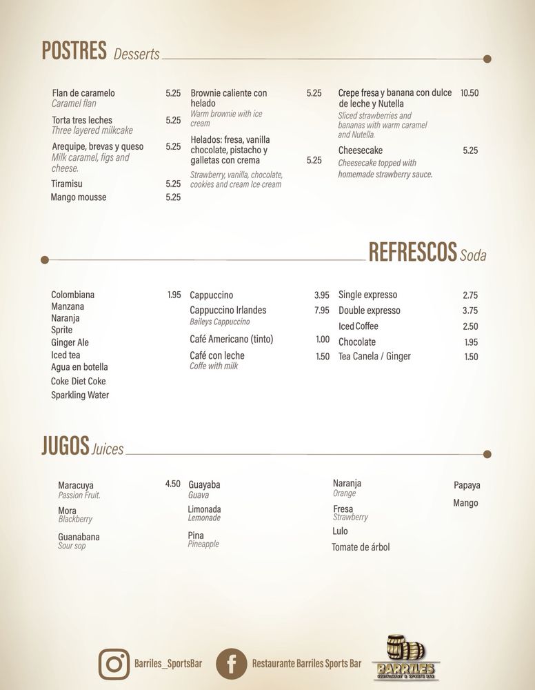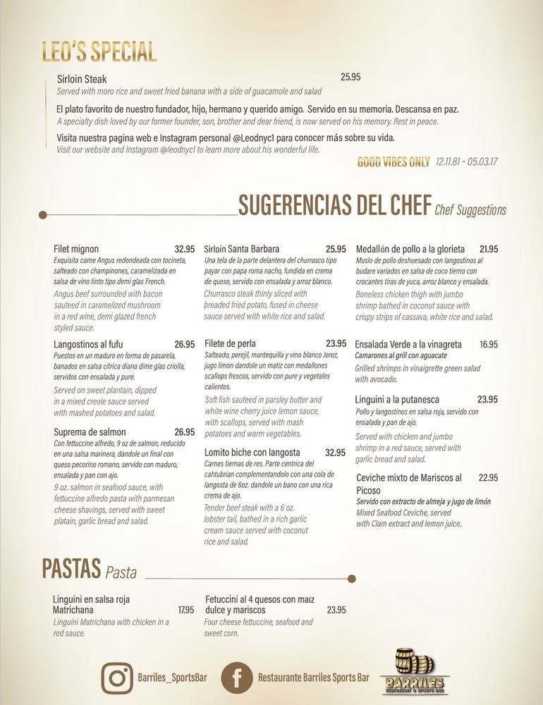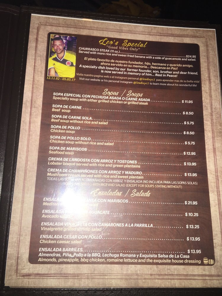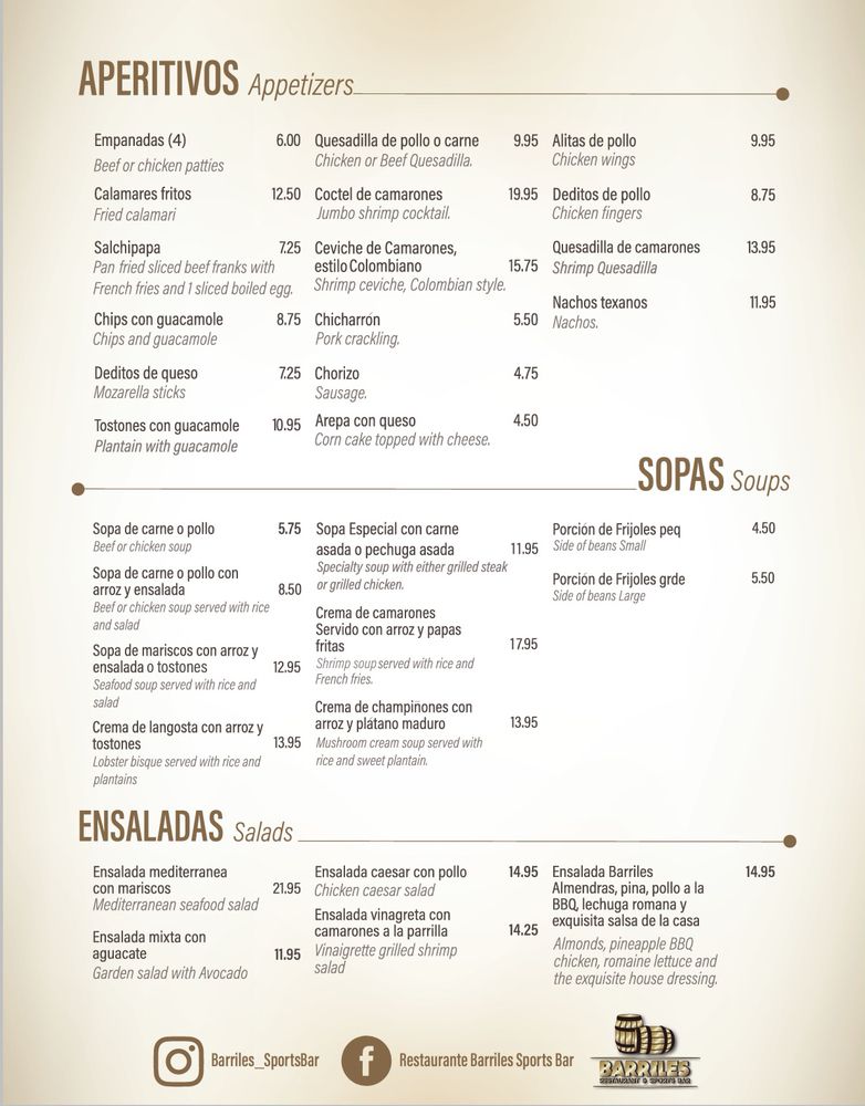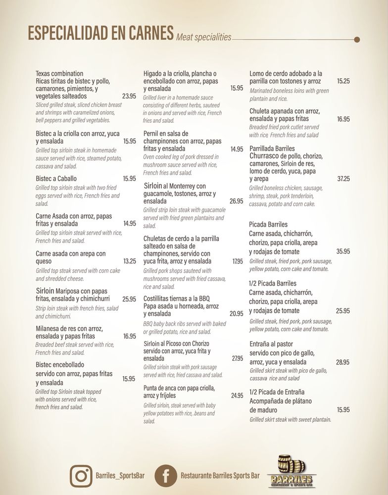 Introducing the menu at Barriles Restaurant and Sports Bar, located in Jackson Heights, NY, a hidden gem offering a unique blend of American and Colombian cuisine. With a homely and family-friendly ambiance, Barriles surprises patrons with its spacious interior adorned with floral details, making it perfect for groups and families. The menu boasts fantastic Colombian food, including the popular Colombiana burger and flavorful steaks. The drink selection, highlighted by margaritas with just the right amount of tequila, is a hit with patrons. While enjoying their meal, guests can catch their favorite sports game on TV or challenge friends to a game of pool. With excellent service, great food, and a welcoming atmosphere, Barriles Restaurant and Sports Bar is a must-visit for a memorable dining experience.